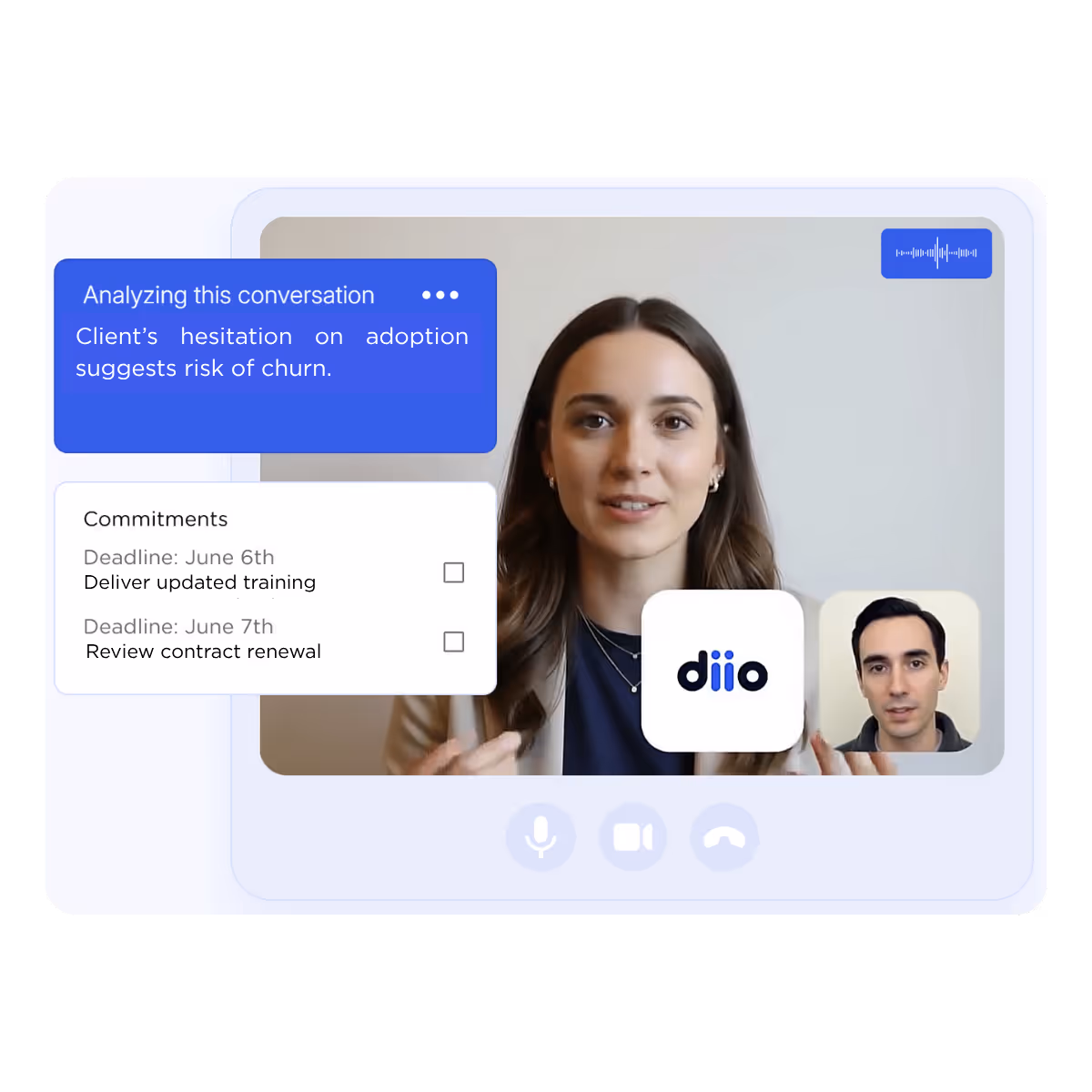 Does your team do follow-up meetings, QBRs, or account reviews? diio analyzes those conversations and shows you the critical points: next steps, churn risks and opportunities for expansion. If you need stronger relationships and more loyal customers, diio is for you.
